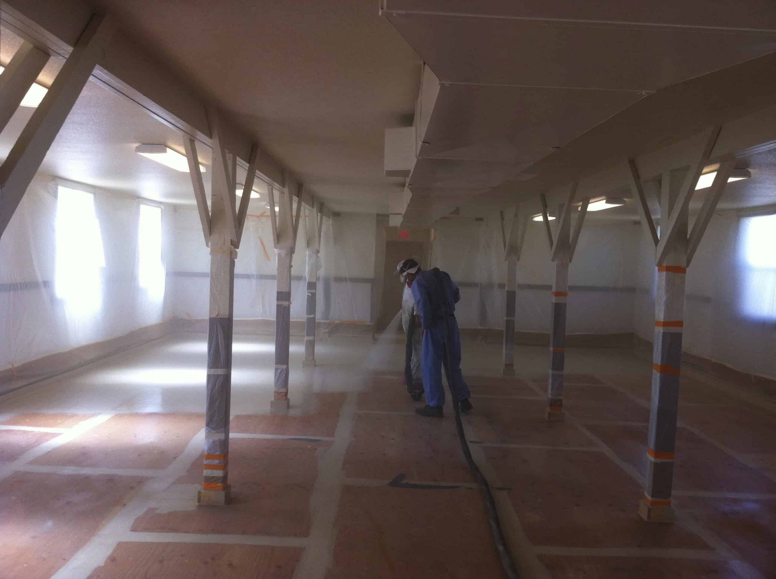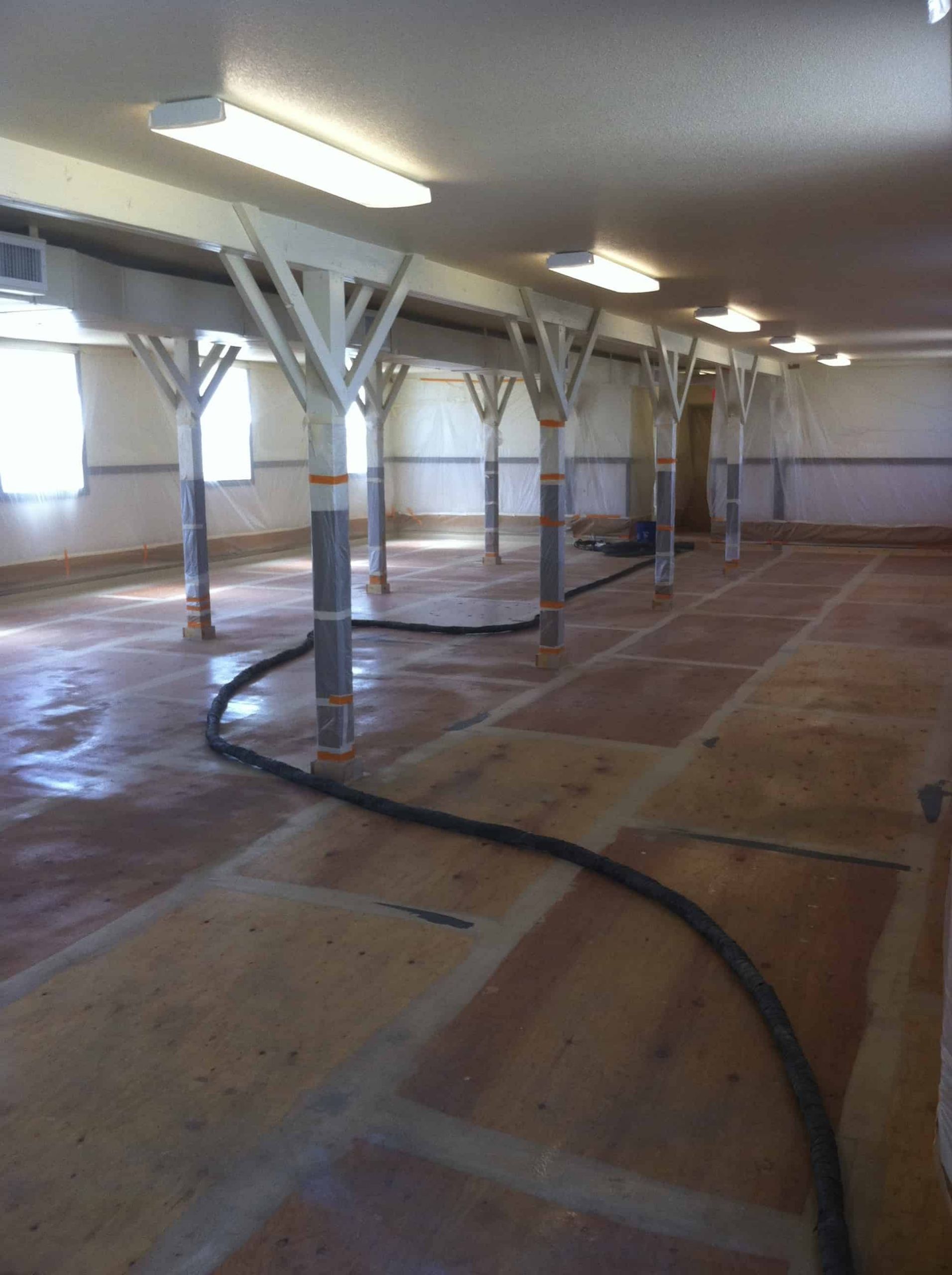Application: since the barracks were from the 1940’s new plywood flooring had to be installed. Freedoms proprietary application of glass fabric was applied over the joints and seams. This insured no splitting of the system if boards were to come loose. Freedoms ft 6160 epoxy primer was applied at 5 mils to seal the wood and avoid pin holeing. Freedoms ft 2202 polyurea was applied at 80 mils per specification and an appropriate texturing method was used to insure a desired finish. A top coat of freedoms ft 4000 polyaspartic was then applied at 8 mils.