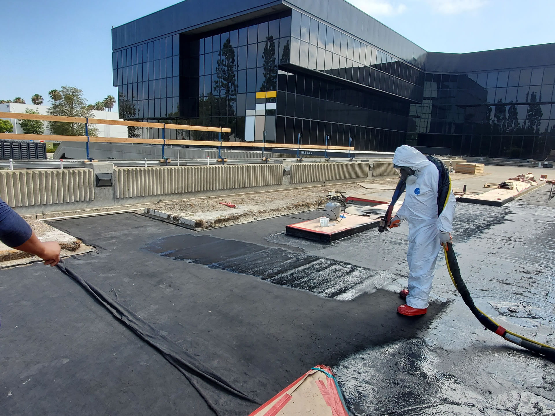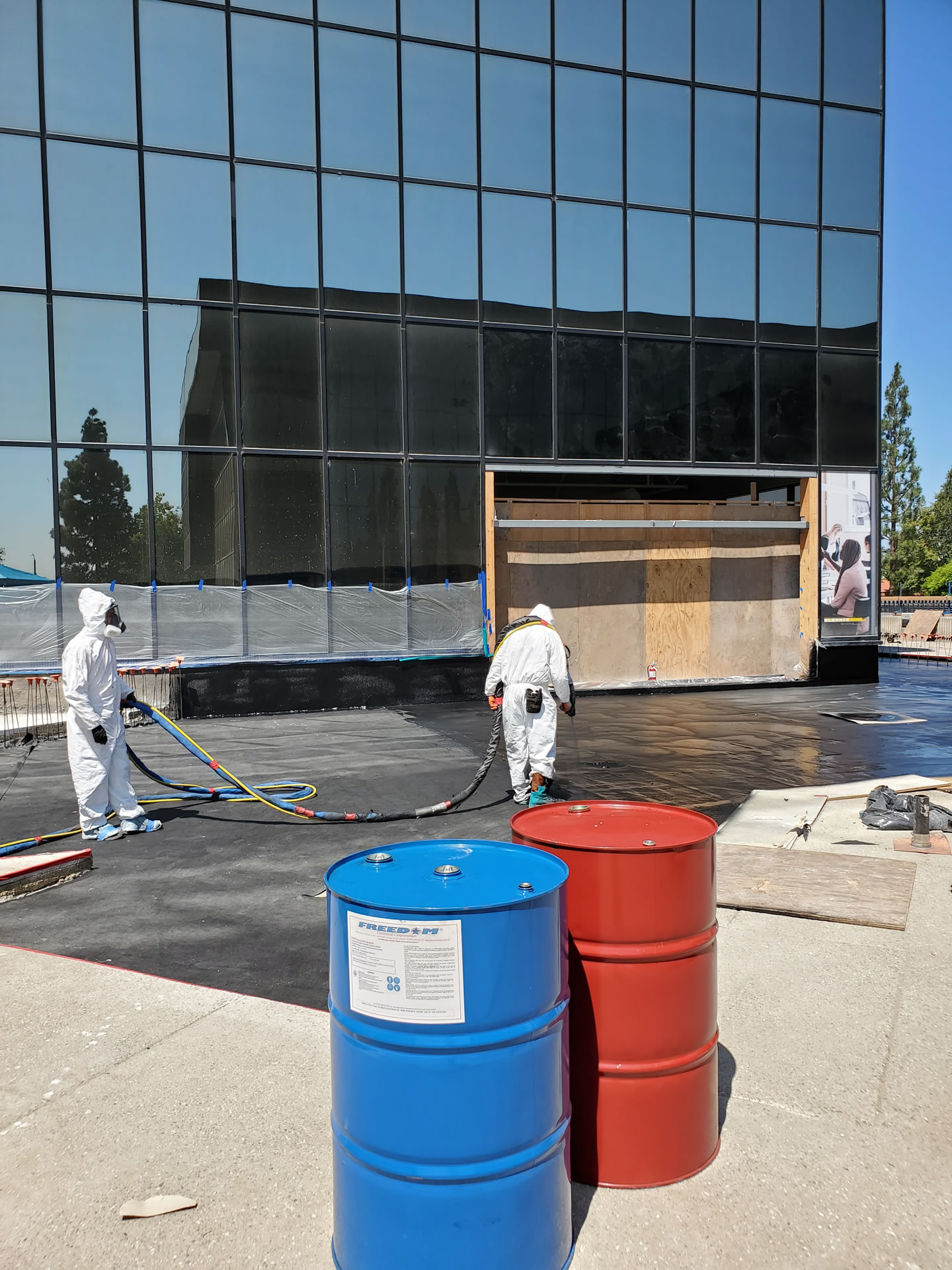 Application: the FreedomTuff™ 2202 polyurea and geotextile application was chosen to eliminate the need for removal of the existing membrane. This saved the client time and money. A 10 oz non-woven geotextile was used which had a barned side to help improve the coverage of the polyurea. FreedomTuff™ 2202 Polyurea was applied at a rage of 5 gallons per 100 sqft (80 mils) over the geotextile up to parapet walls and the slab of the building. FT-6160 Epoxy primer was used at 0.5 gallons per 100 sqft (8 mls) over the concrete parapets and slab and FreedomTuff™2202 was applied to the primer to secure the system including fabric in place.