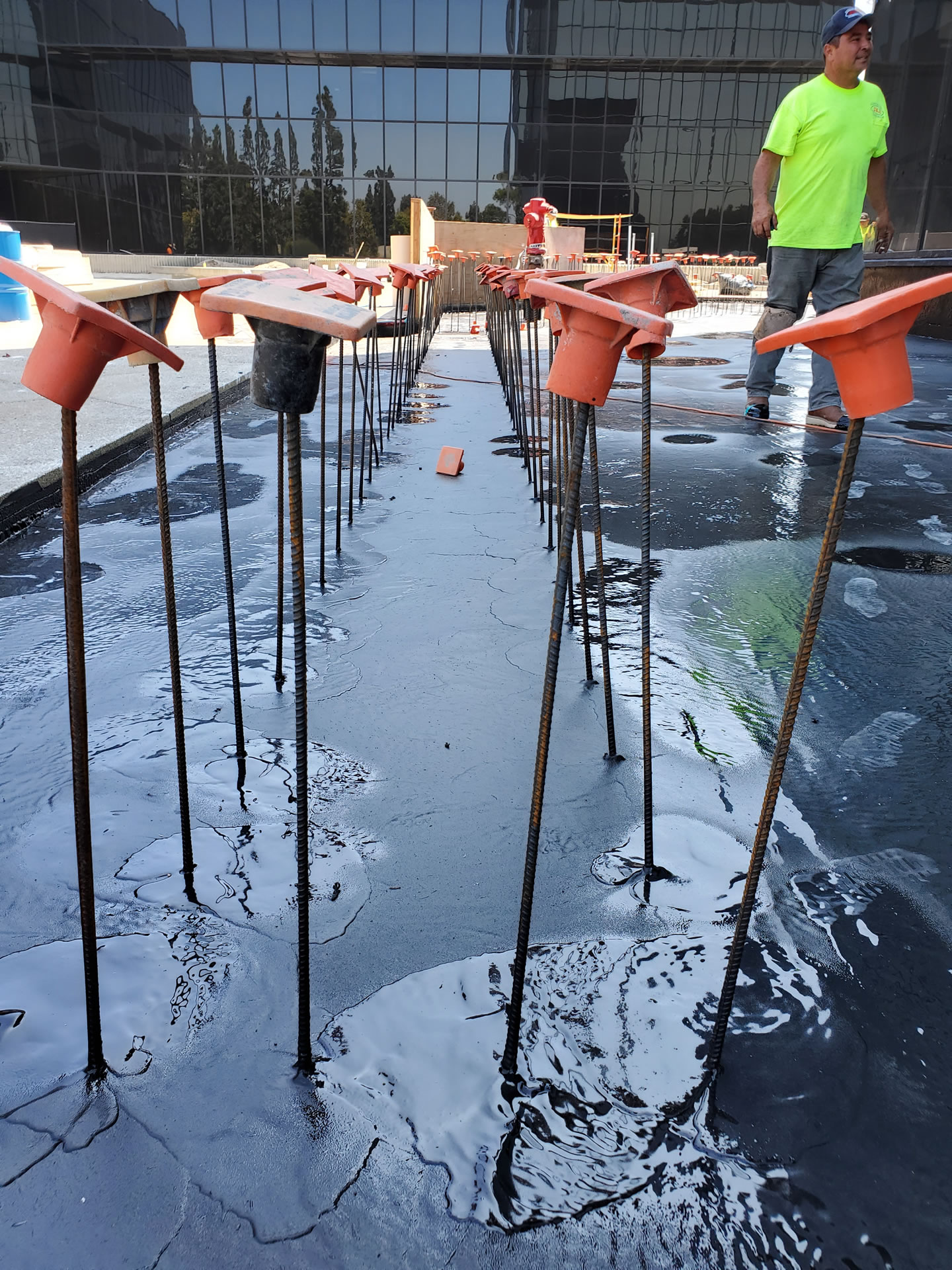 Project Description: Elevate at 5504 Harbor Blvd. in Costa Mesa, CA was being remolded to make the office building more modern and help bring in new tenants. The exterior podium deck which is over parking and office space was leaking. ADDITIONALLY, the remodel plans included adding more drains and green space to the ~35,000 sqft space.