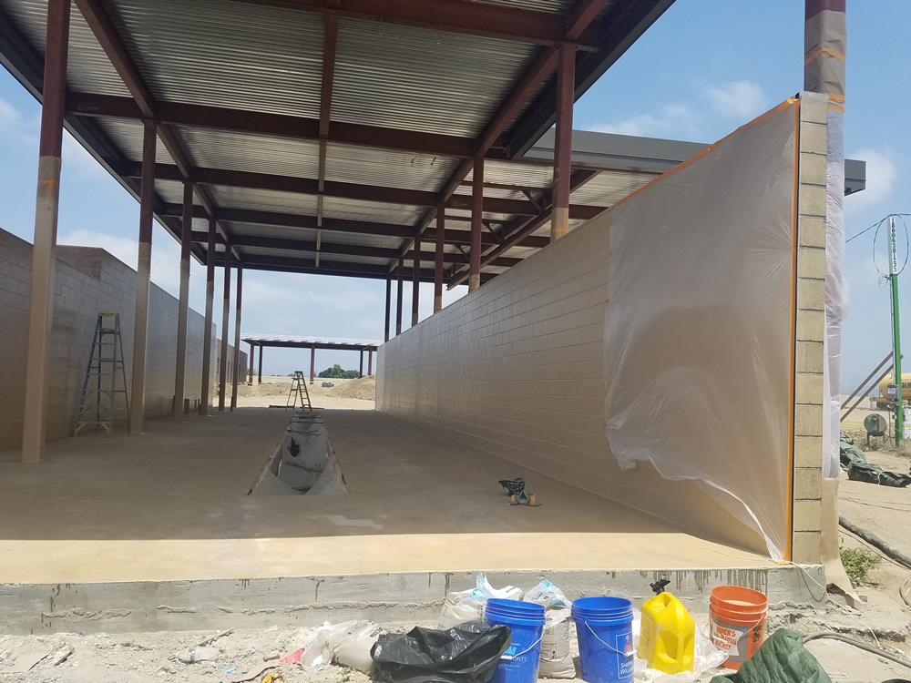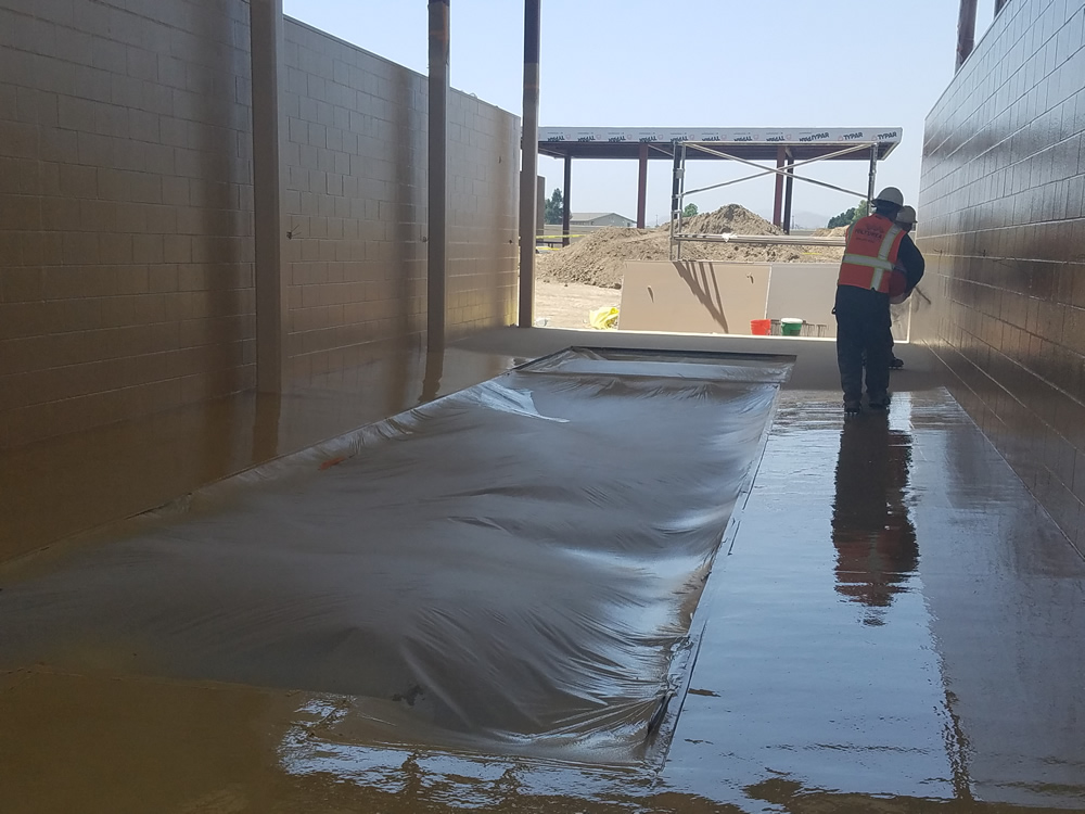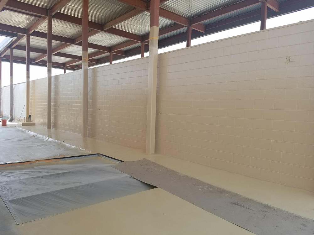 Prior to the application of the GuardianDeck™ substrate (concrete) was prepped by shot blasting it to a CSP 4-7 to remove any existing contaminates or coating. First the Tuff® 6160™ primer was applied to the CMU and concrete surfaces and allowed to dry overnight before applying FreedomTuff® 2202 polyurea to the CMU walls and floor areas. The walls only required FreedomTuff® 2202 to protect the CMU walls from the chemicals of the washdown. The floor required a slip resistant surface for the maintenance crew to walk on this was accomplished by applying FreedomTuff® 4300 with sand and the FreedomTuff® 4000 polyaspartic topcoat.