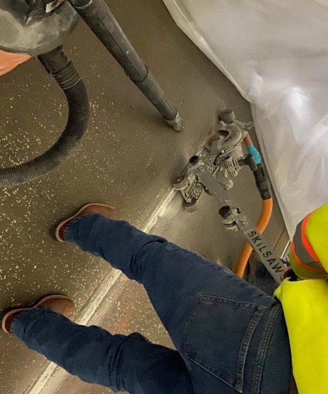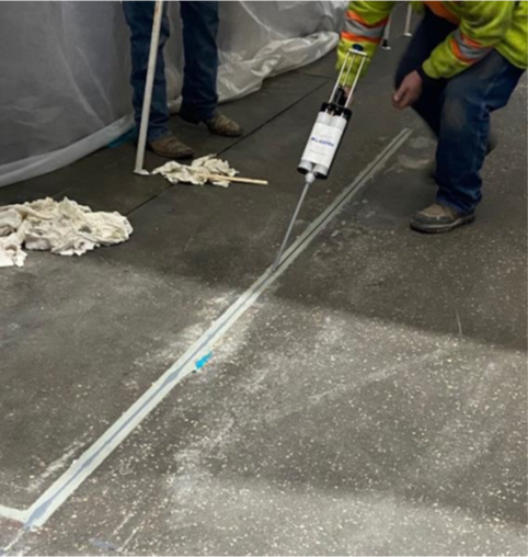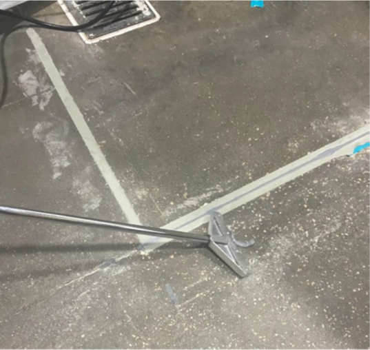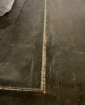 Solution: KDX Coatings, selected Freedom Chemical’s Polymer systems to provide long lasting protection for the warehouse area. Project was done cutting out old, failed fillers and cutting new clean, extra wide joints that will have the edges re-built to accept new Control Joint materials. Heating blankets used to condition FT 9500QF to 80f to prevent a drawn-out cure on the cold floors. The addition of crushed glass as an aggregate medium allows for the contractor to obtain a flowable consistency most suited to the application. Simple 1:1 mix ratio with an addition of about 30% glass by volume measurement. Installation of FT9700CJ deliberately overfilled so that when shaved (picture provided below) it provides a fully flush finish to the existing substrate. Thereby protecting the edges of the joint from the hard wheel forklift traffic. FT9700CJ is ideal to repair and protect joints in exposed concrete retail floor and warehouse floors from further deterioration. At the end of the day’s repairs, a small spall was noticed at the edge of a joint. Using FT9200S, a very fast setting general adhesive/repair system, the repair was made and returned to service within 2 minutes. The product here was in a neutral color but is available in colors.
