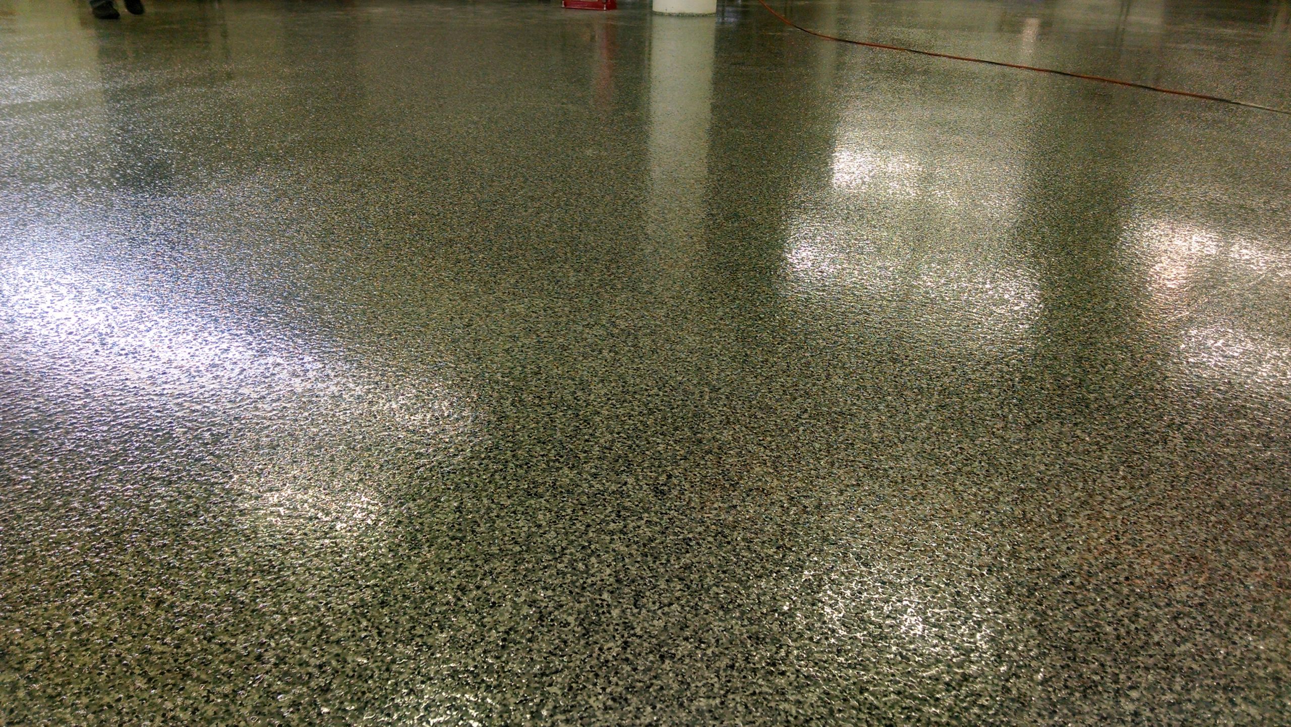 Application: The concrete was shot blasted to spec. the cracks were filled with a single component urethane and allowed to cure for minimum 24 hours. One coat of FT6160 was applied at 5 mils thick. Next FT4300 StoneGrip was applied at 20 mils neat. Another coat of FT4300 StoneGrip Grey was applied at 24 mils and a full broadcast of color paint chips were added. Next the paint chicks were scrapped to remove the high spots. The 1st coat of FT4200 GripSeal Clear was rolled out at 5 mils. The last coat of FT4200 GripSeal was added within 3 hours and allowed to cure for 72 hours before traffic.