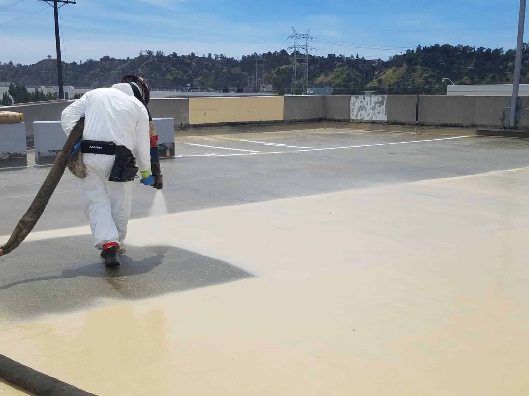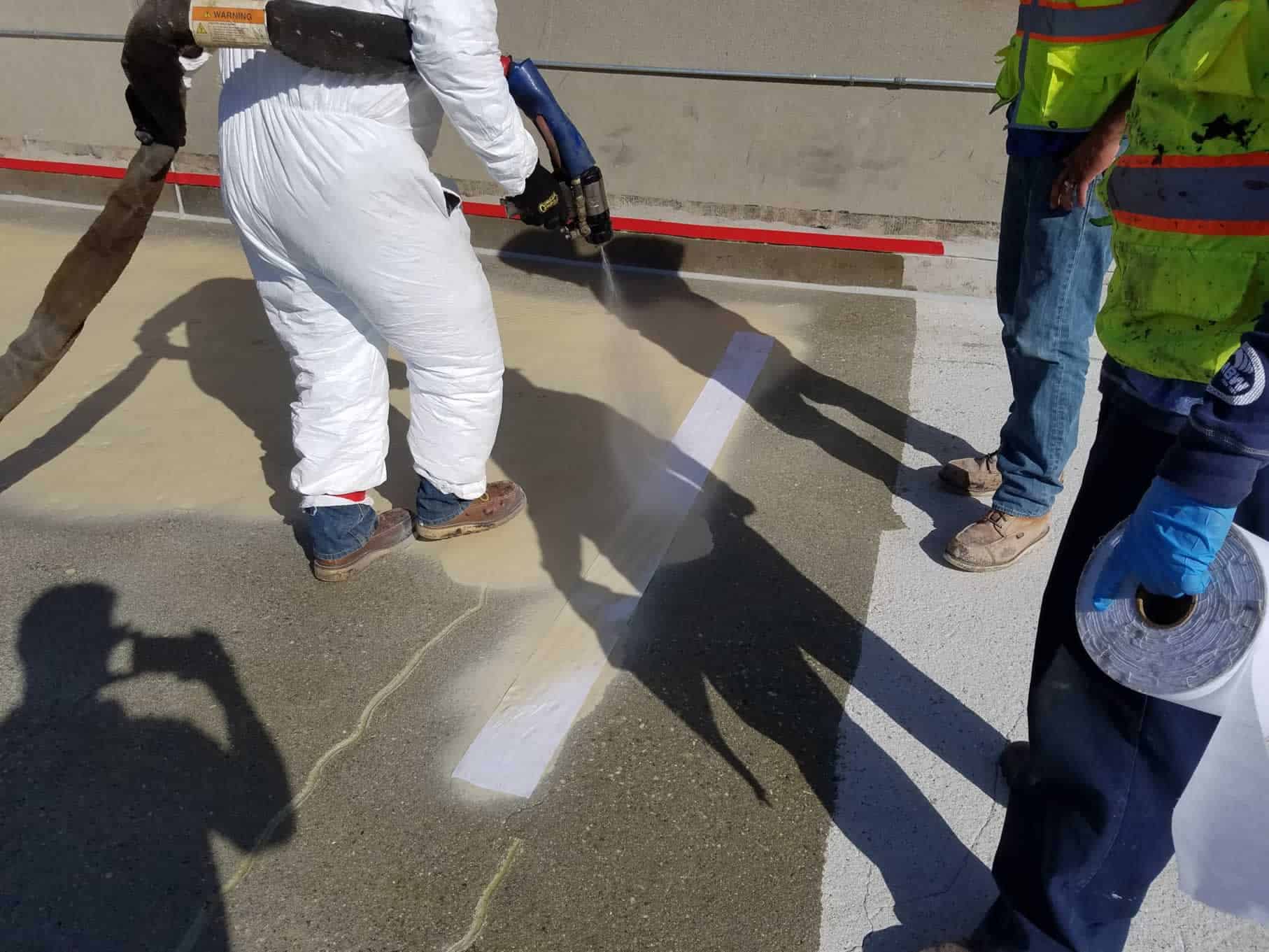 Application: The asphalt and hot tar system were removed. The concrete was shot blasted to a csp 4 – 5. Cracks were routed and filled with a 2k urethane. New drains and overflow drains were added. Ft-6160™ primer was applied at 5 – 7 mils and a light broadcast of 30 mesh sand was added. For cracks larger than 1/16” wide fabric was sprayed in place with 40 mils of ft-2202™ polyurea. Ft-2202™ polyurea was applied at 80 mils. Ft-4300™ polyurethane was applied at 16 mils and a 10 mesh sand was heavy broadcast as a mechanical key for the asphalt. The asphalt was installed the next day.