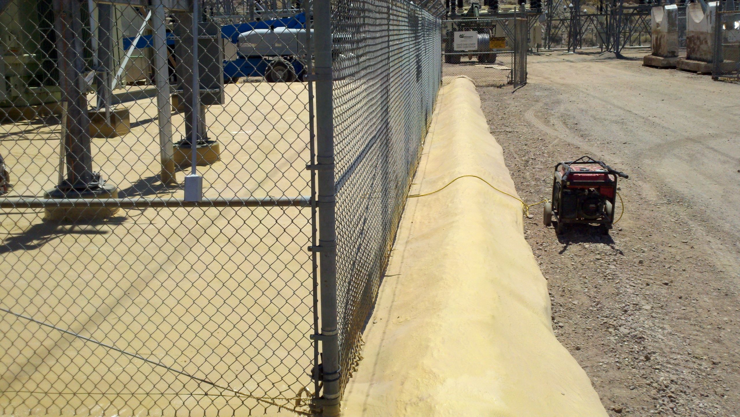 Application: freedomtuff™ 2202 polyurea was chosen as the membrane since its phyisical properties provide flexibility across varying temperature ranges seen the in desert. The membrane would have to be installed over loose soil so an 8 oz geo fabric was used as a substraight. Then freedomtuff™ 2202 polyurea was applied at 100 mils . Per freedoms recommendations, ¼” keyway terminations were used in areas over concrete. Consideration was given to the rapid and extreme temperature swings. Therefore, appropriate slack was left to accommodate for expansion and contraction of the coating system.