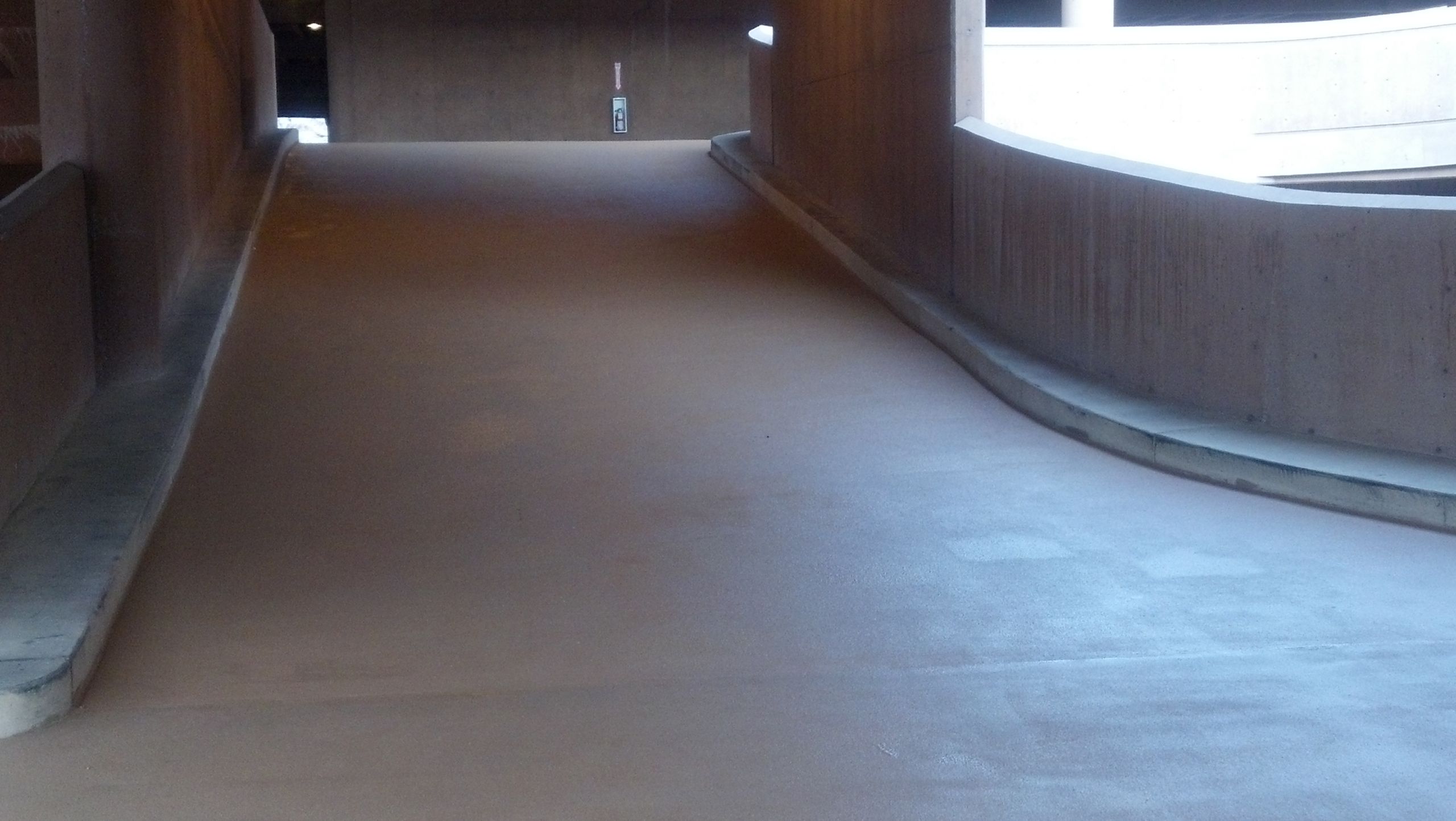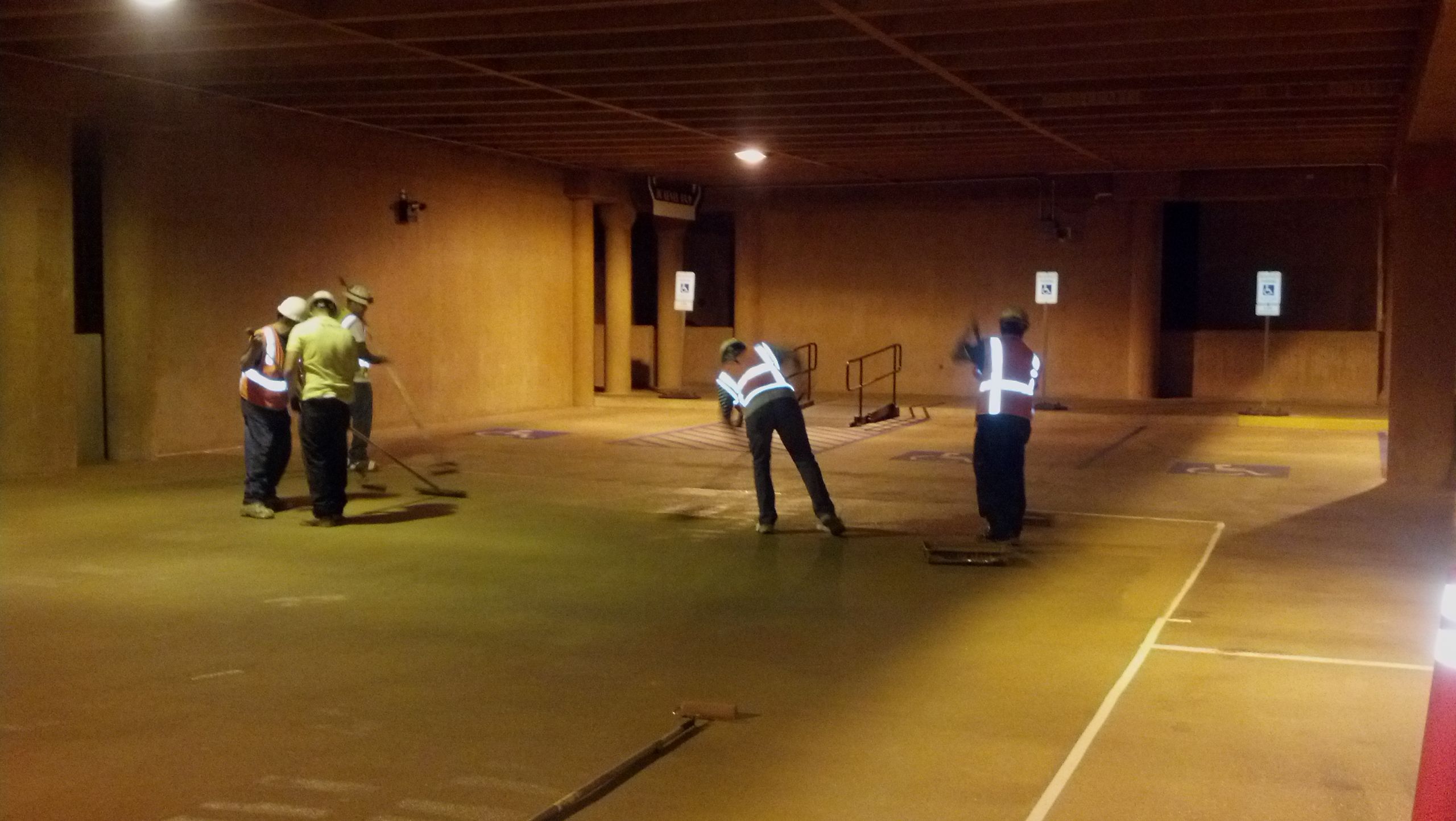 Project description: in December 2012, during an active coatings project, the hoover dam parking structure faced an issue with the coating system specified for the deck. After the installer had completed the specified coating system over the flat surfaces of the parking deck structure, it became apparent both the durability and cure schedule of the system was suspect for the drive lanes and turning radiuses. Since the parking structure gets as much as 10,000 cars a day, having 12 hours of cure time for the topcoat being used before returning to traffic was unexceptable. In addition to the timing concerns, there was question about the “texture” achieved by the specified system not being durable enough for the drive lanes.