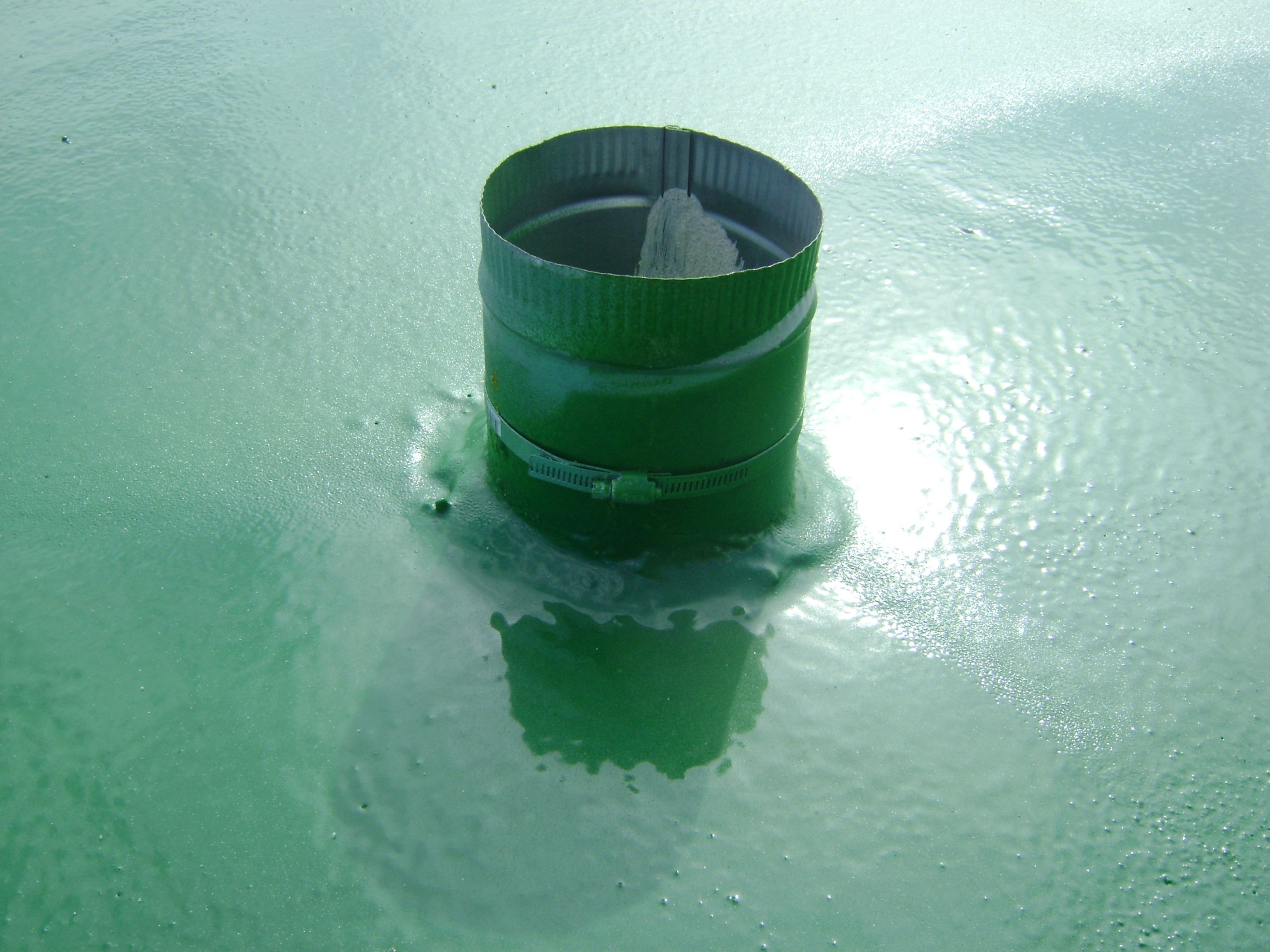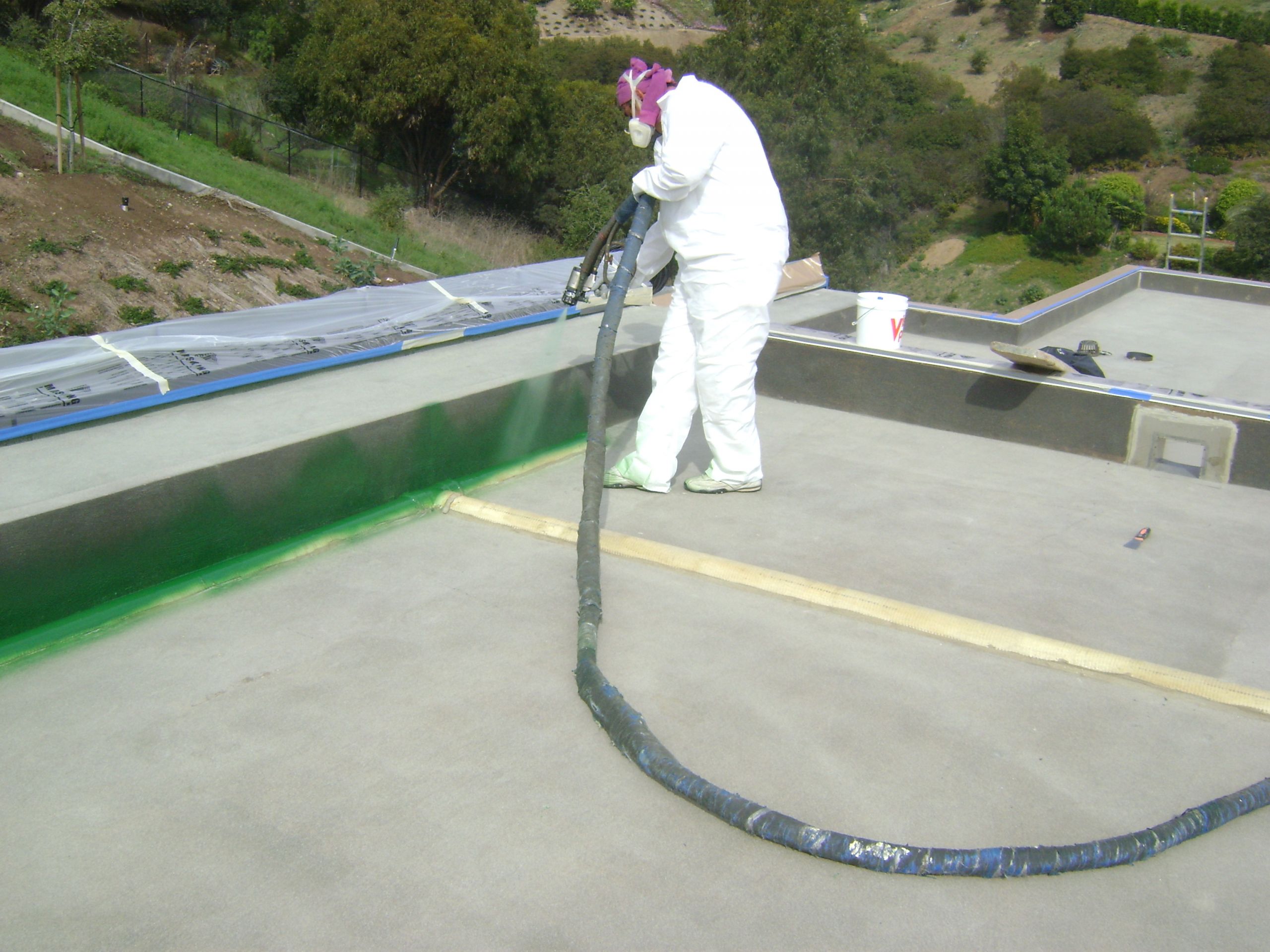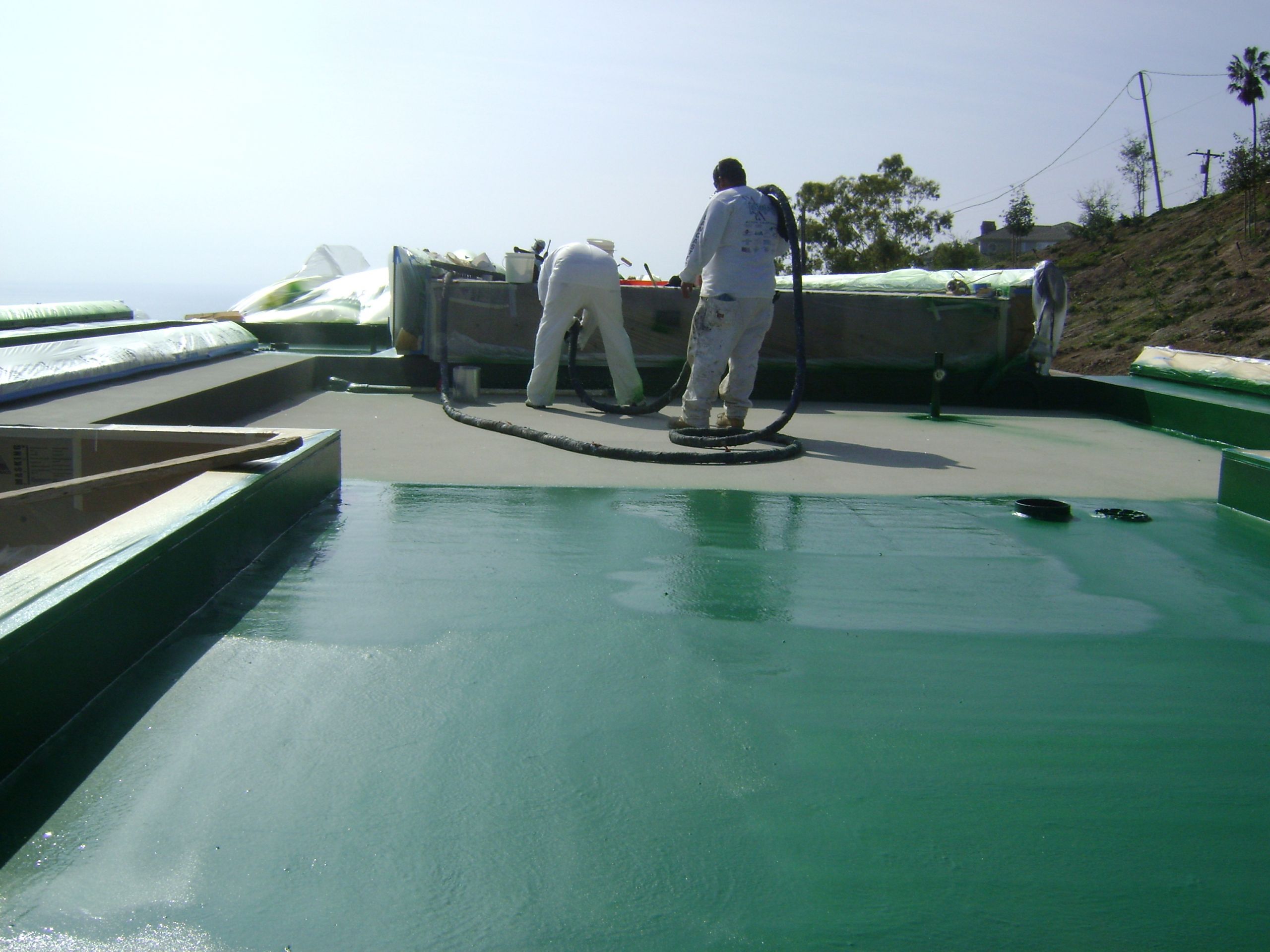 The surface of the roof was prepared according to Freedom® Chemical Corporations specifications. Freedomtuff® 6160 was applied at 8 mils and a 30-mesh sand was broadcast into the primer, then the Freedomtuff® 2190 polyurea was sprayed at 80 mils and 40 mils of Freedomtuff® 4300 was applied over the surface.